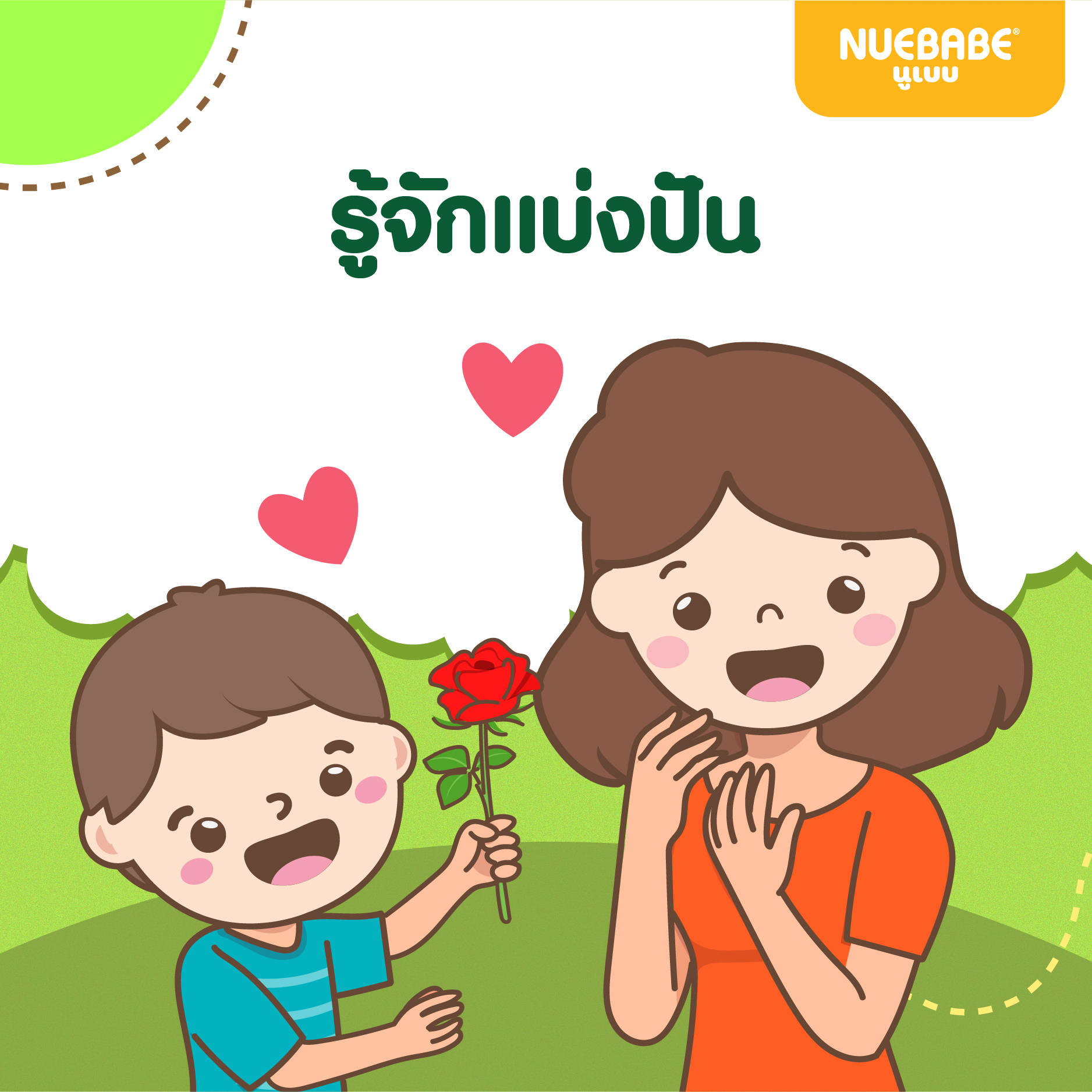 สอนให้เขารู้ว่าการแบ่งปันคือการเอาใจใส่และเป็นการแสดงน้ำใจที่ดี ไม่ว่าจะเป็นการแบ่งปันของเล่นหรืออาหาร ต้องเริ่มสอนให้เขารู้จักแบ่งปันสิ่งเล็ก ๆ ภายในบ้าน ค่อยฝึกไปเรื่อย ๆ และเขาก็จะนำนิสัยนี้ไปใช้กับคนภายนอกนั่นเอง
