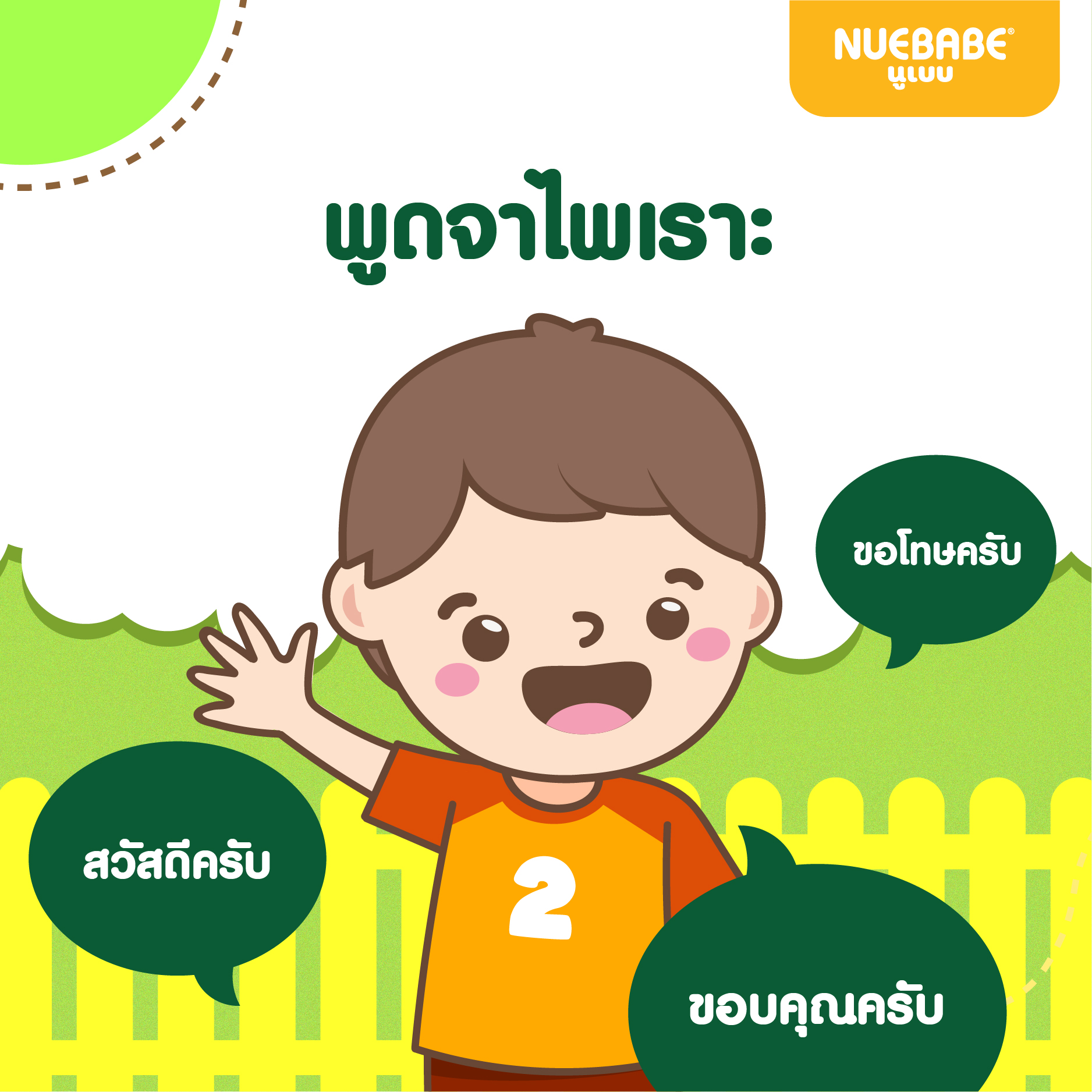 สอนให้พูดด้วยถ้อยคำที่ดีและพูดด้วยความจริงใจ เขาก็จะจดจำและนำไปใช้ตลอดเวลา เช่น การกล่าวคำทักทาย การกล่าวขอบคุณเมื่อมีคนชมหรือให้ของ การกล่าวขอโทษเมื่อเผลอทำสิ่งที่ผิดลงไป