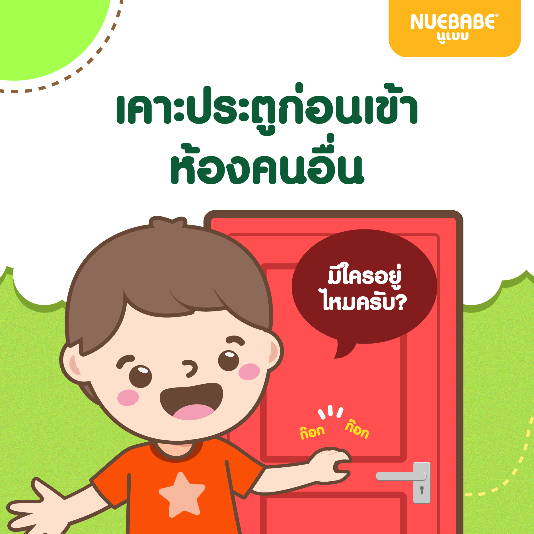 ไม่ว่าจะเข้าบ้านใครหรือที่ไหนก็ตาม ต้องสอนให้เขารู้จักเคาะประตูเพื่อขอนุญาตจากเจ้าของซะก่อน เพื่อเป็นการเคารพพื้นที่ส่วนตัวของคน ๆ นั้น
