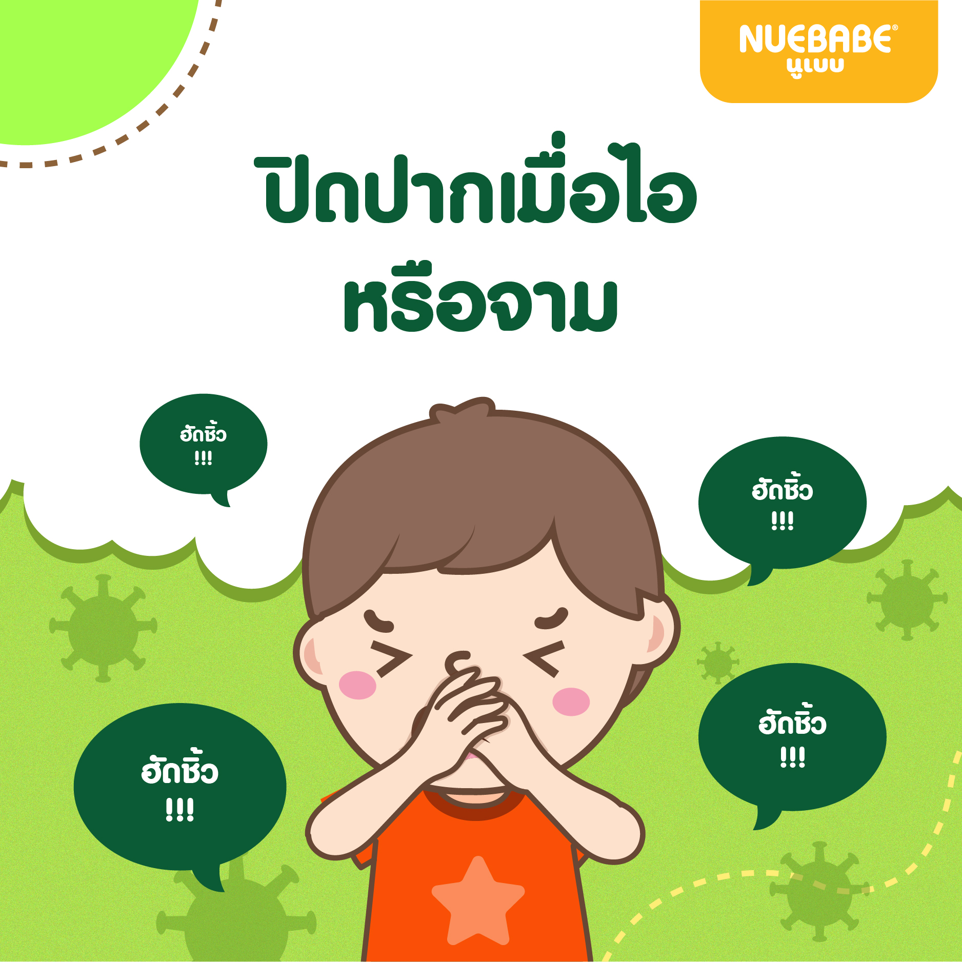 หากมีอาการที่จะไอหรือจามในที่สาธารณะ ต้องสอนให้เขารีบนำมือหรือผ้ามาปิดปากทันที เพื่อป้องกันไม่ให้เชื้อโรคแพร่กระจายไปยังผู้อื่นและยังช่วยรักษาสุขอนามัยของส่วนรวมได้ด้วย