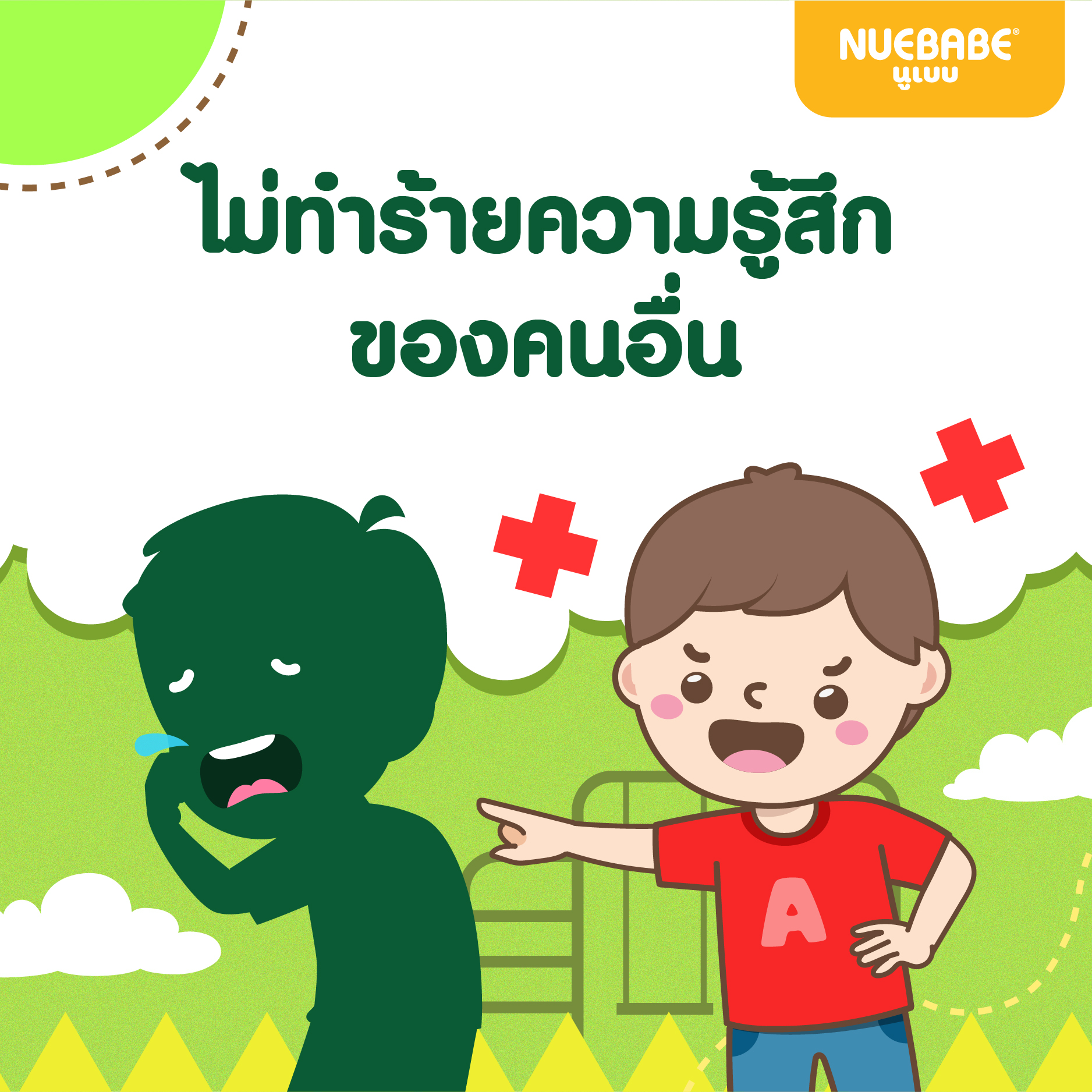 ต้องสอนให้เขารู้ว่า การทำร้ายความรู้สึกของคนอื่นไม่ใช่สิ่งที่น่ารักและน่าทำซะเลย เพราะสิ่งเหล่านั้นจะทำให้ผู้ที่ถูกกระทำเกิดบาดแผลภายในใจได้